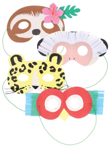 A set of 8 paper party masks with 4 designs – 2 x sloth, 2 x jaguar, 2 x monkey, 2 x parrot
