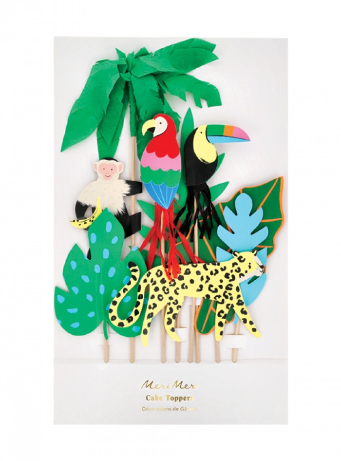 Set of 8 jungle cake toppers – a parrot, toucan, monkey, jaguar, a palm tree and leaves