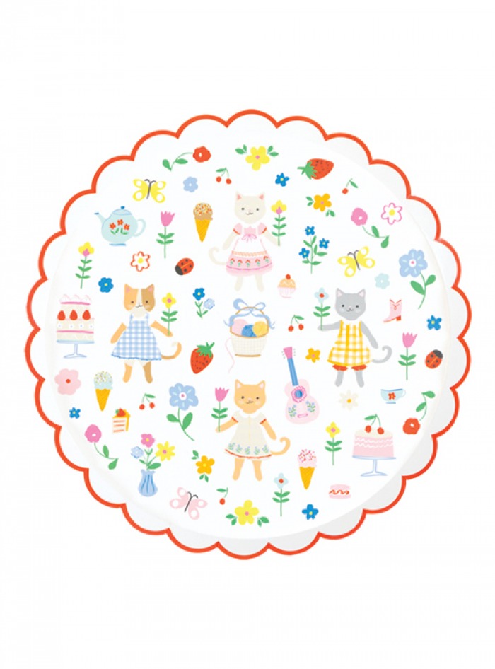 Bring the playful sophistication of the folk interior trend to children’s parties with these Kitten Club dinner plates. Featuring a red scalloped border, each paper plate showcases charming kittens in traditional folk dress amid flowers, guitars, cakes, ice cream, butterflies and balls of yarn. Perfect for young animal lovers, they will add a whimsical, storybook enchantment to every celebration.