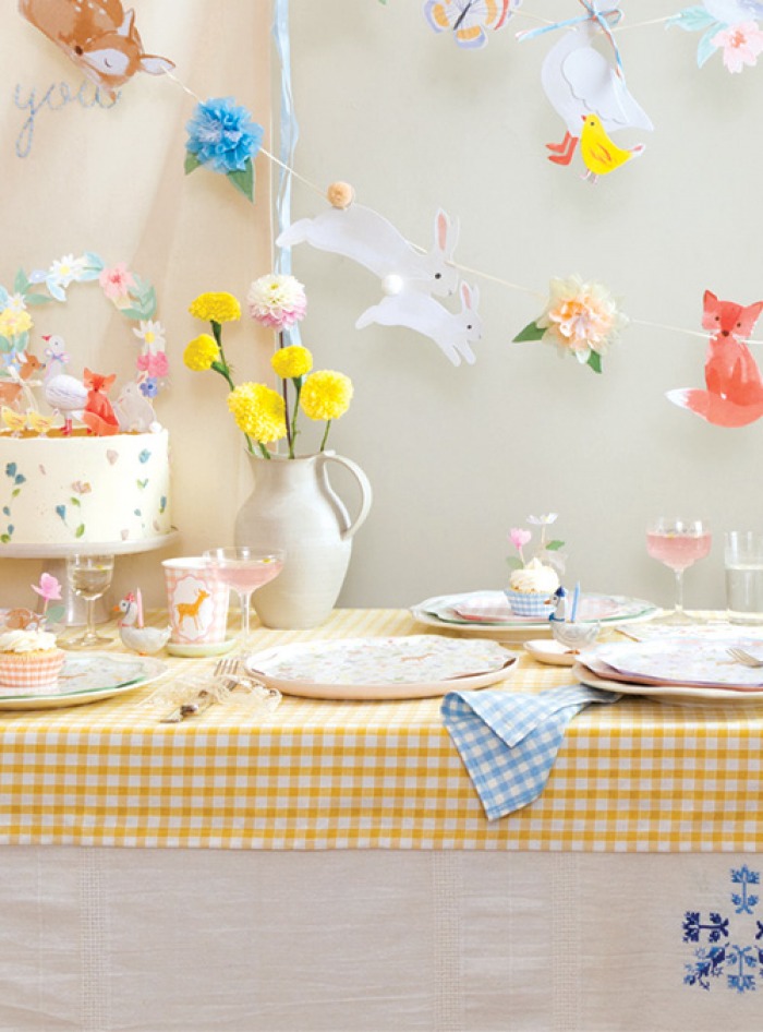 Οι απαλές υδατογραφίες με ζωάκια και λουλούδια, μαζί με το κυματιστό περίγραμμα, κάνουν το τραπέζι να μοιάζει διακόσμηση βάπτισης. Ταιριάζουν τέλεια με παστέλ μπαλόνια και γλυκά.